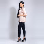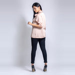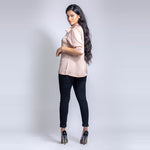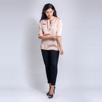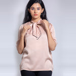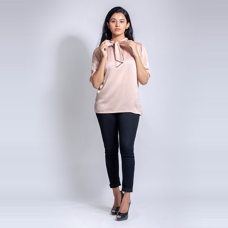 Top with sheen and tie up around the neck and 3/4th sleeves. The details let you customize your look, and the fabric blend is comfortable and flattering.