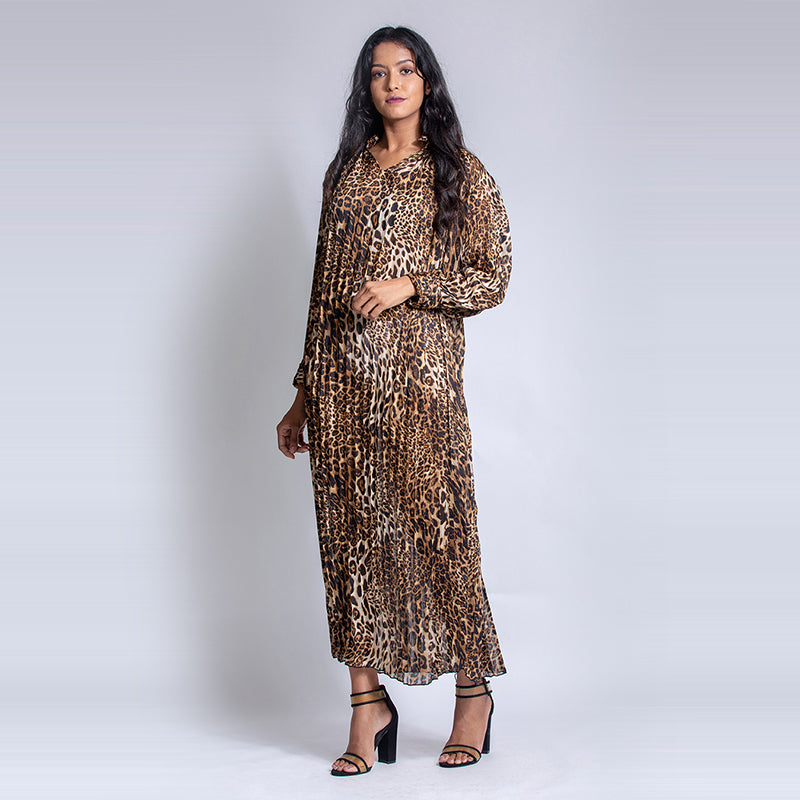 Animal print maxi dress with full sleeves and a cloth material tie up belt around the waist. Closed chinese collar with a lace of same print to tie up the collar. This maxi dress is not only stylish, but also comfortable and functional. The cloth material belt can be adjusted to flatter any size and shape, and the Chinese collar can be finished off with the lace tie for a classic and sophisticated look.