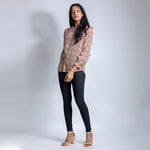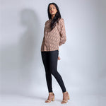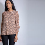 Long sleeve shirt featuring a v-neck, matching trims and buttons fastening at the front.