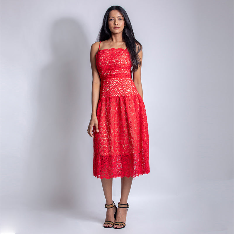 Spaghetti sleeved cut work midi dress with zip fastening from behind. This gives a perfect shape to your waistline. A perfect pick for a dinner date.