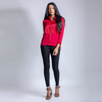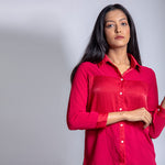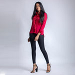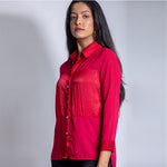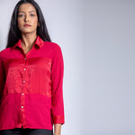 Full sleeves shirt with button fastening in front. Velvet patch work on the Chest and collar. Pair it with a trouser, denim or skirt.