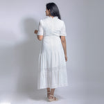 Hakoba midi length short sleeve dress with round neck and a tie up around waist. Best worn with flats or heels.