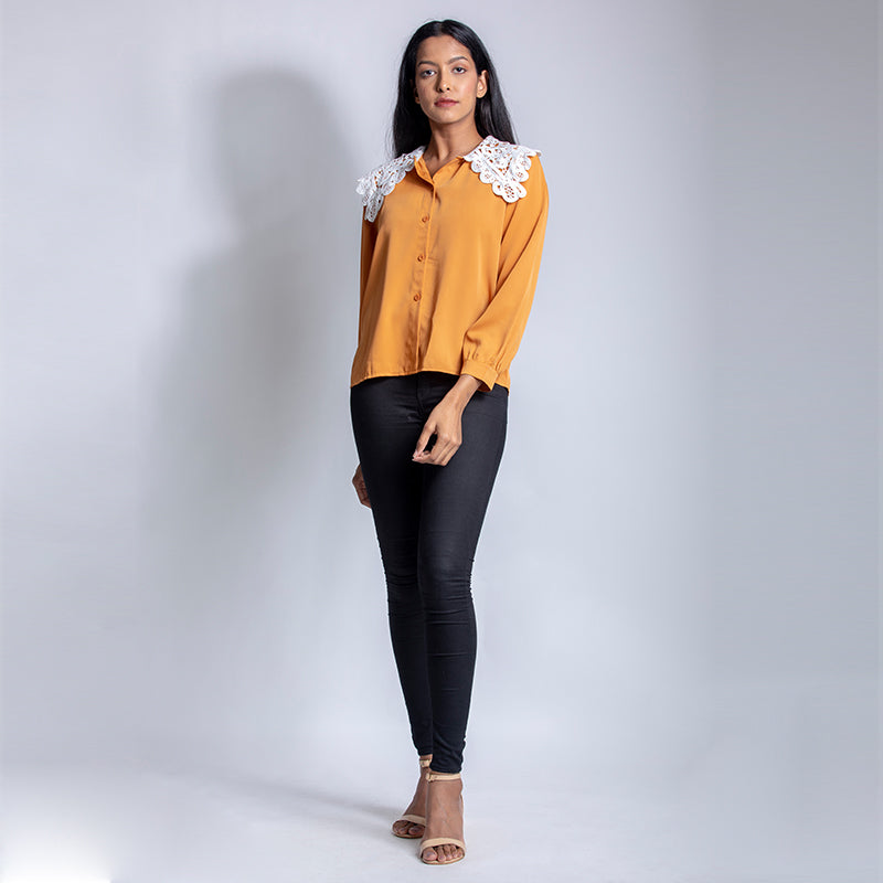 Fitted separate white collared shirt with long sleeve and button-up front.