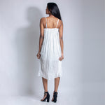 Spaghetti sleeved midi length plain white summer dress with an adjustable strap.