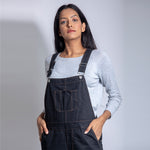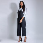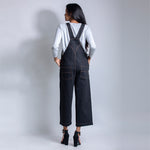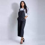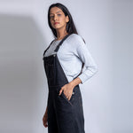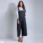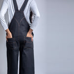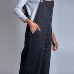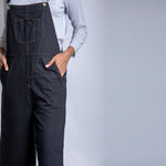 Dark blue denim solid color, ankle length, buttons on the sides. Slip pockets on the sides and insert pockets at the back. Adjustable suspenders with metal fasteners.