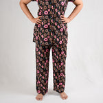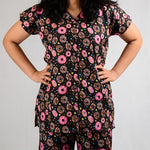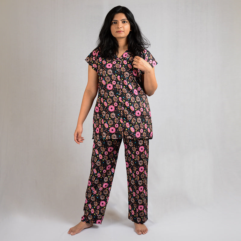 - Designed with bold donut prints, this set consists of a shirt which has a lapel collar, button placket with short sleeves and elasticated pyjamas.