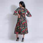 Black dress with floral print and thigh high slit and 3/4th bell sleeves. Cut from lightweight fabric, the dress is designed to keep you cool and breezy, even in the hottest of summer days.