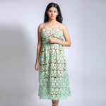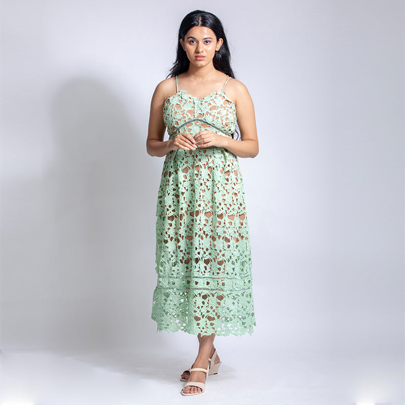Lace midi dress with spaghetti sleeves. Zip fastening behind. The dress is best worn for a night out. Perfect with heels.