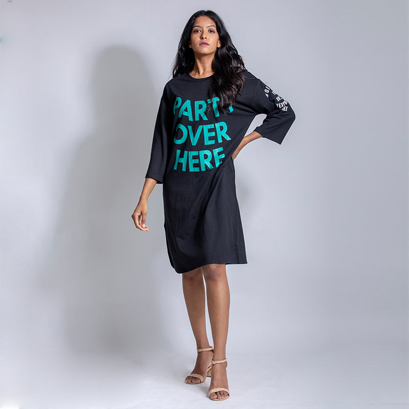 Knee length oversized round neck t-shirt. Party over here is printed in the front. Wear this with white shoes for a perfect casual day look.