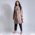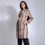 Snake print trench coat with a collar, long sleeves, featuring front pockets and buttons fastening in front.