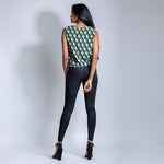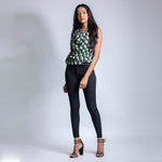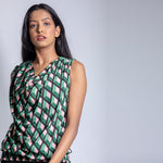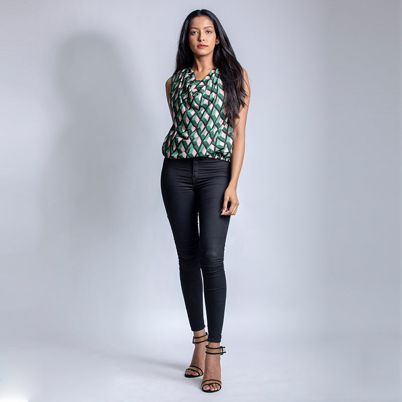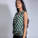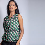 Sleeveless printed blouse with gathering near the neckline and elastic at the bottom. Best worn with denims.