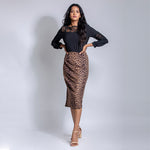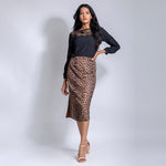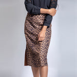 Leopard printed midi length skirt with one side slit and zip fastening on the side. You can pair this up with a patent heels and a black or a white top.