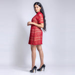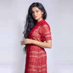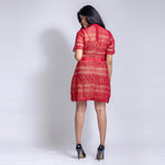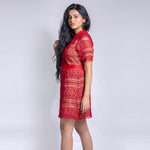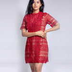 Short high neck lace red dress with short sleeves and cut work. Transparent at the front portion. The dress combines feminine detailing with comfort and breathability. Made from a lightweight yet durable fabric, it's perfect for any formal or casual occasion.