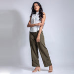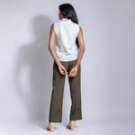 Sleeveless shirt with round neck and cut work. Self print along the sides.