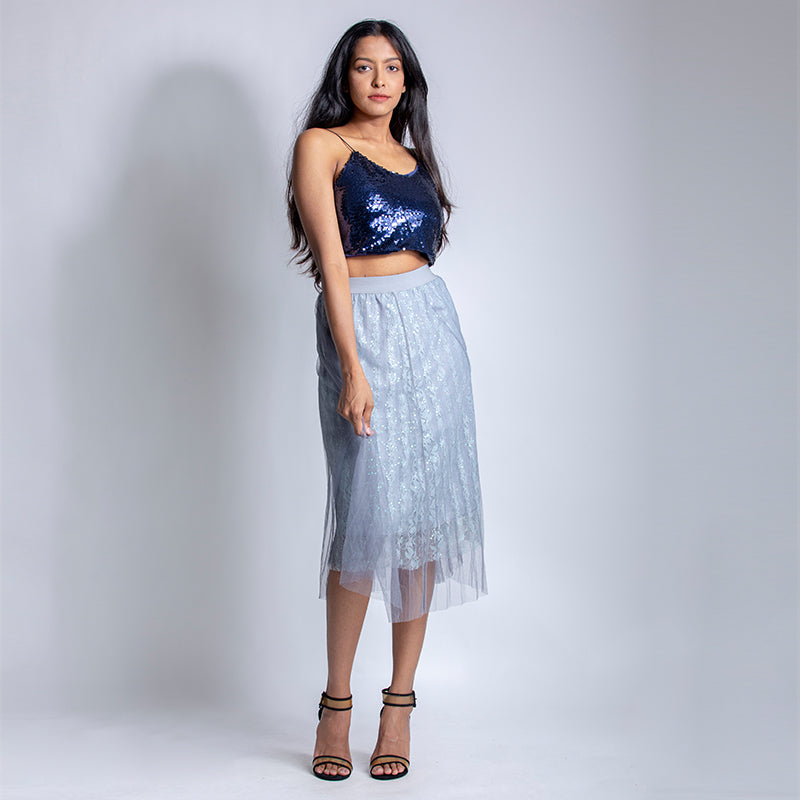 Spaghetti strapped crop top with sequins in front. Perfect to pair it with a denim jacket or blazer.