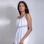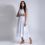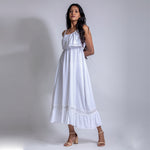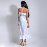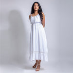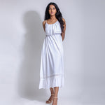 Midi spaghetti sleeve dress with elasticated waist. Lace design at bottom of the dress. Best worn with flats or heels.