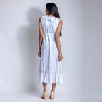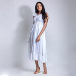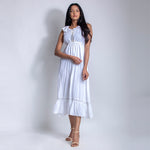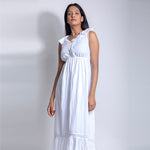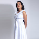 Long sleeveless midi white dress with v-neck. Frill around the neckline. Lace running round the neckline and hem. Elasticated near the waistline.