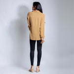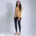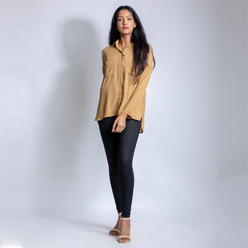 Long sleeve shirt featuring a v-neck, matching trims and buttons fastening at the front.