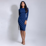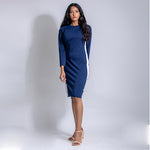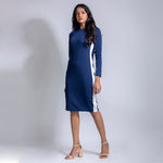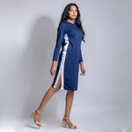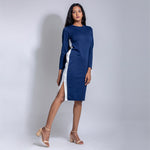 A-line knee length body-con dress with full sleeves and slit on one side of the dress.