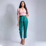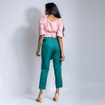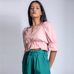 Crop top with square neck and 3/4th sleeves. Elasticated waist to accentuate the waistline. Cutwork in front of the top. Button fastening in front.