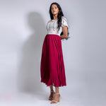 Flared pleated midi skirt with elasticated waist. Best styled with patent heels.