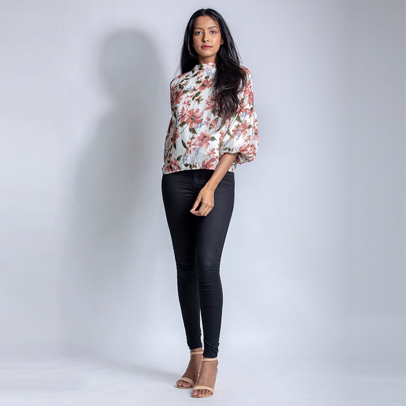 Printed floral closed neck top with balloon sleeves. Best worn with denims or pencil skirts.