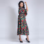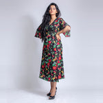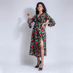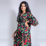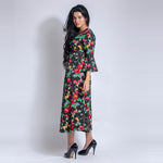 Black dress with floral print and thigh high slit and 3/4th bell sleeves. Cut from lightweight fabric, the dress is designed to keep you cool and breezy, even in the hottest of summer days.
