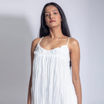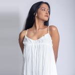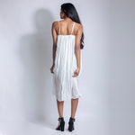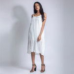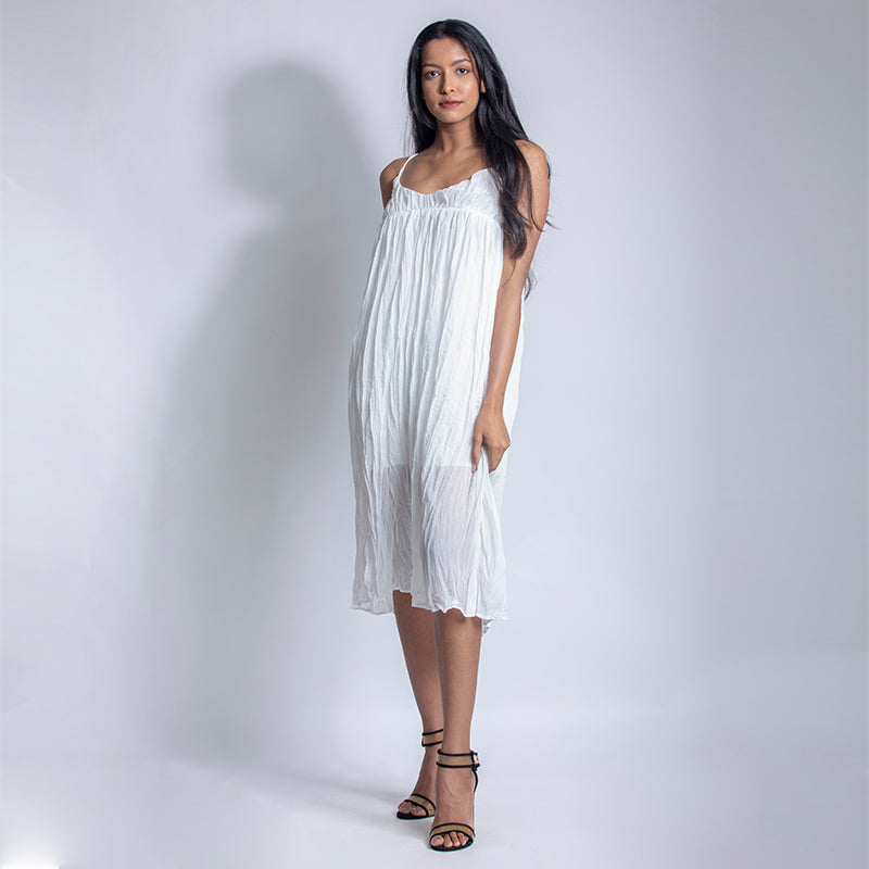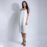 Spaghetti sleeved midi length plain white summer dress with an adjustable strap.